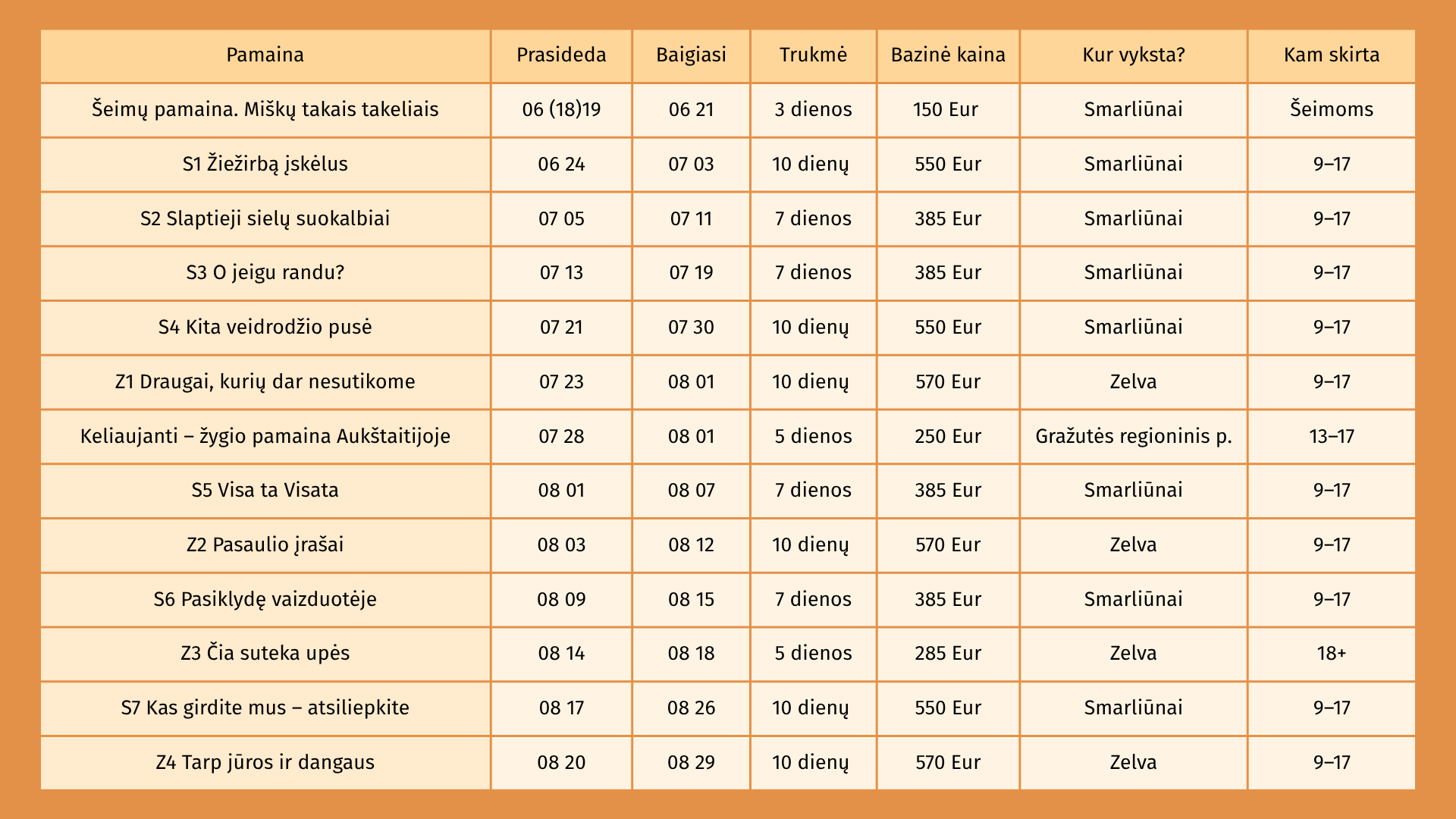 ⏰ Stovyklos programa organizuojama atgajietišku ritmu, bet su festivališku lankstumu: dalyviai patys pasirenka, ar visuose užsiėmimuose ir programos dalyse dalyvaus.